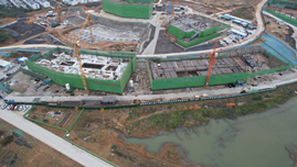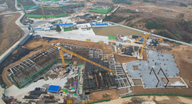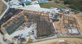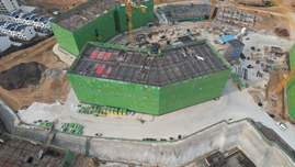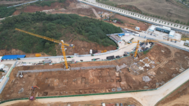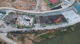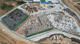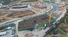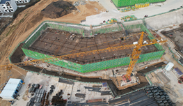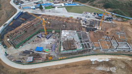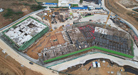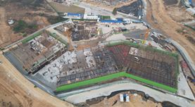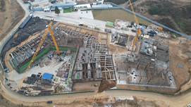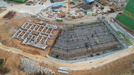 6、1#食堂及生活中心:地上建筑面积5706平方米,地下建筑面积2230平方米。地下室外墙、顶板混凝土建筑完成,地上一层+5.15标高梁板柱混凝土浇筑完成,正在搭设二层满堂脚手架。