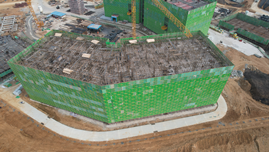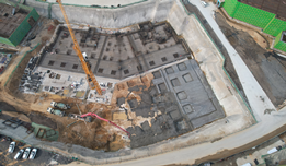 4、教育学院:建筑面积41534.7平方米。A单元及B单元有大跨度梁,为满足含钢量要求,加入型钢梁柱,施工难度较大。A单元地下室外墙、梁板混凝土浇筑完成,正在搭设一层脚手架及模板。B单元支设一层顶板模板、绑扎钢筋,搭设外立面钢板防护网。