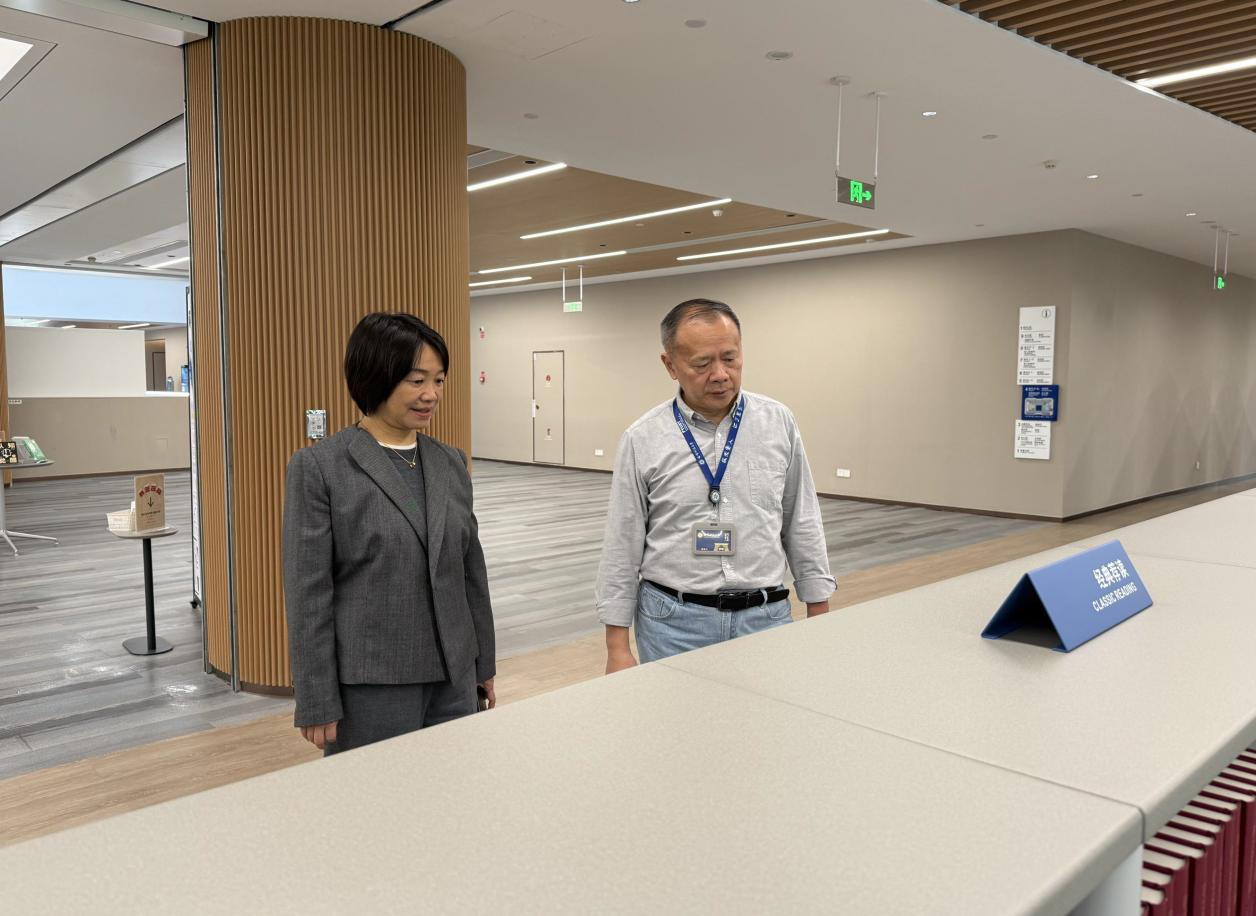 考察人员带着图书馆建设的核心需求,在各图书馆负责人的陪同下深入实地调研,就建设过程中如何兼顾馆藏安全、读者体验与学科服务需求等问题与对方深入探讨,收集了多项可落地的实操经验。高涵在与福耀科技大学图书馆邓景康馆长交流过程中,重点聚焦空间规划与装修设计,详细考察了阅览区、研讨室、音乐图书馆休闲空间的布局逻辑,对环保材料选用、灯光氛围营造、智能设备嵌入等装修细节进行细致询问,深入了解现代化高标准大学图书馆的设计理念与建设过程。